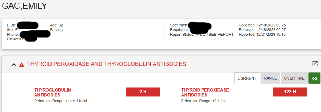 Thyroid Lab Results: My naturopath had run additional labs to check my thyroid and found that I had Hashimoto’s disease. I had previously been diagnosed with this after I found out I had Crohn’s disease in 2019, but my doctor at the time said there was nothing that could be done to address it and was likely caused by Crohn’s. Now, my naturopath was prescribing additional supplements and dietary changes that would help improve thyroid function and the skin and hair issues I was dealing with as well. I began incorporating these changes into my life and we planned to run these labs again in three months to see if things had improved.